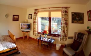 The apartment consists of a large bedroom which can easily accommodate a sofa in order to turn it into a bed-sitting room. It has en-suite facilities and a small self-contained kitchen. The apartment has its own entrance hall.